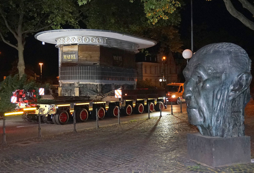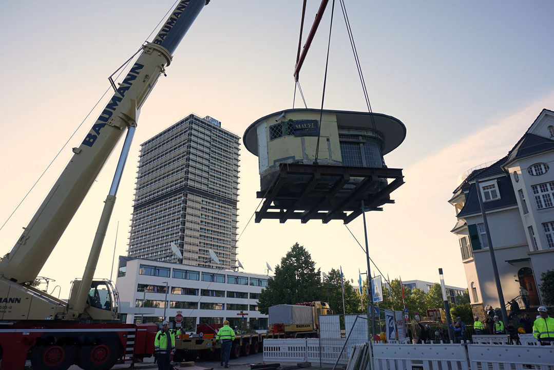 The moment had come: In the early morning hours of Sunday, 17 May 2020, the cult object of the Bonn Republic – the historic Federal Kiosk – was loaded onto a flatbed trailer at the building yard in Hersel and transported to its new site on the corner of Heussallee and Platz der Vereinten Nationen. The Kiosk arrived between 5 and 6 am. Between 6:30 and 7 am a special crane then lifted the little building onto its new location. With the return of the Bundesbüdchen, the Friends of the Historic Kiosk are delighted that its restoration, in keeping with the guidelines for historic monuments, can now finally begin.